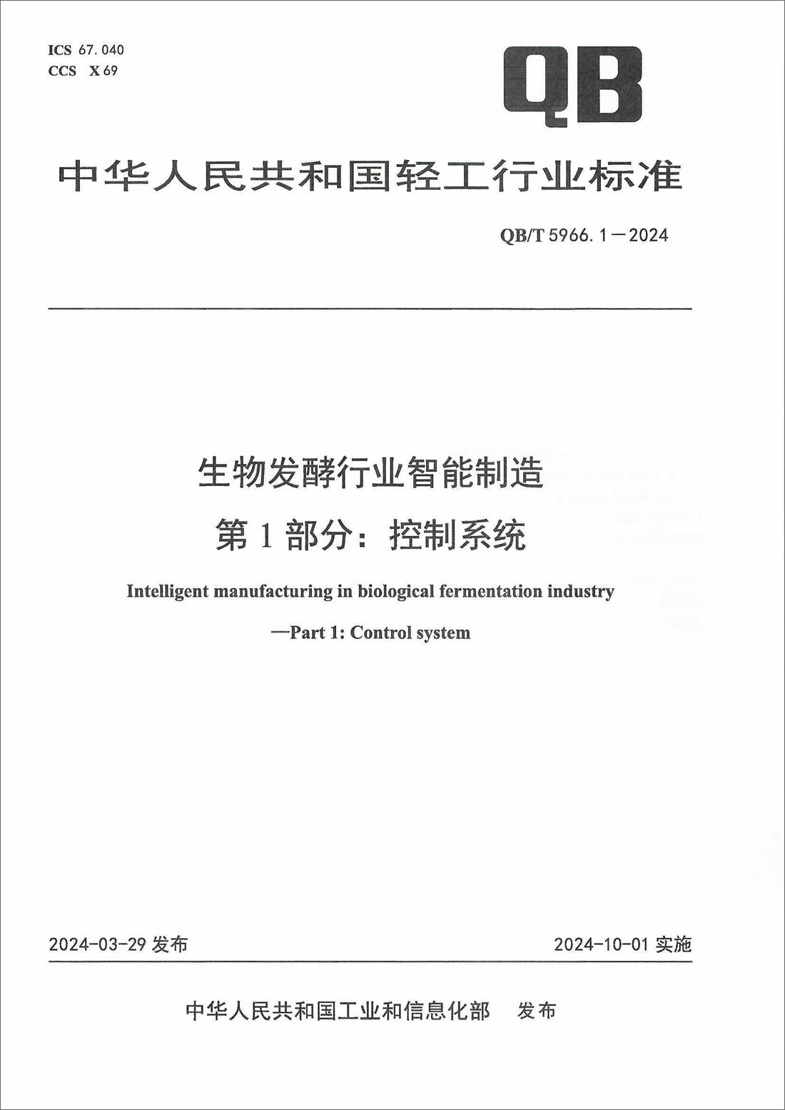东方生工参与起草制订的中华人民共和国轻工行业标准QB/T 5966.1—2024《生物发酵行业智能制造 第1部分:控制系统》已正式发布,将于2024年10月1日开始实施。