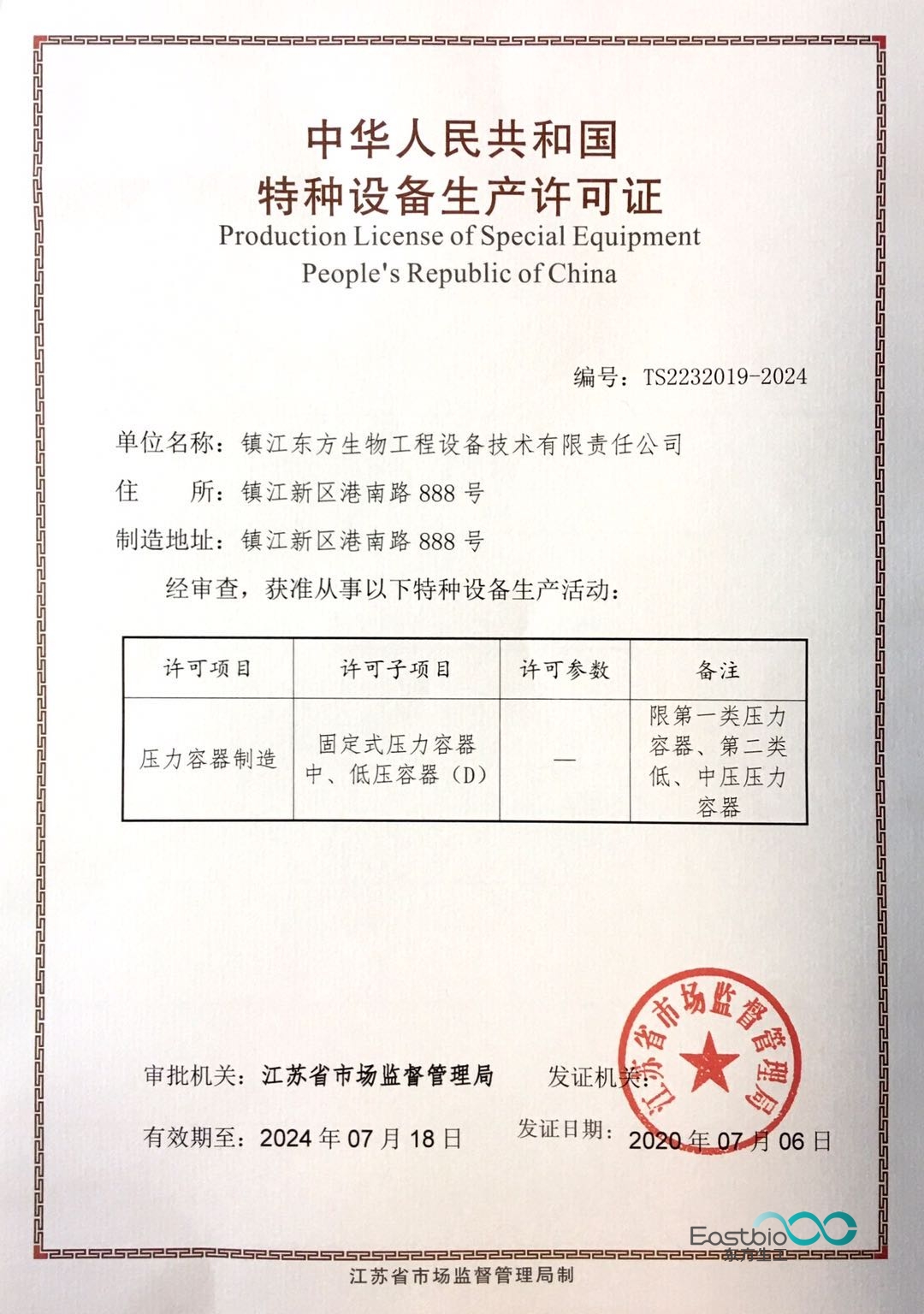 东方生工于2020年6月份对即将到期的压力容器制造许可证申请换证复审,2020年7月6日,江苏省市场监督管理局向东方生工颁发新的特种设备(压力容器)生产许可证,有效期至2020年7月18日。